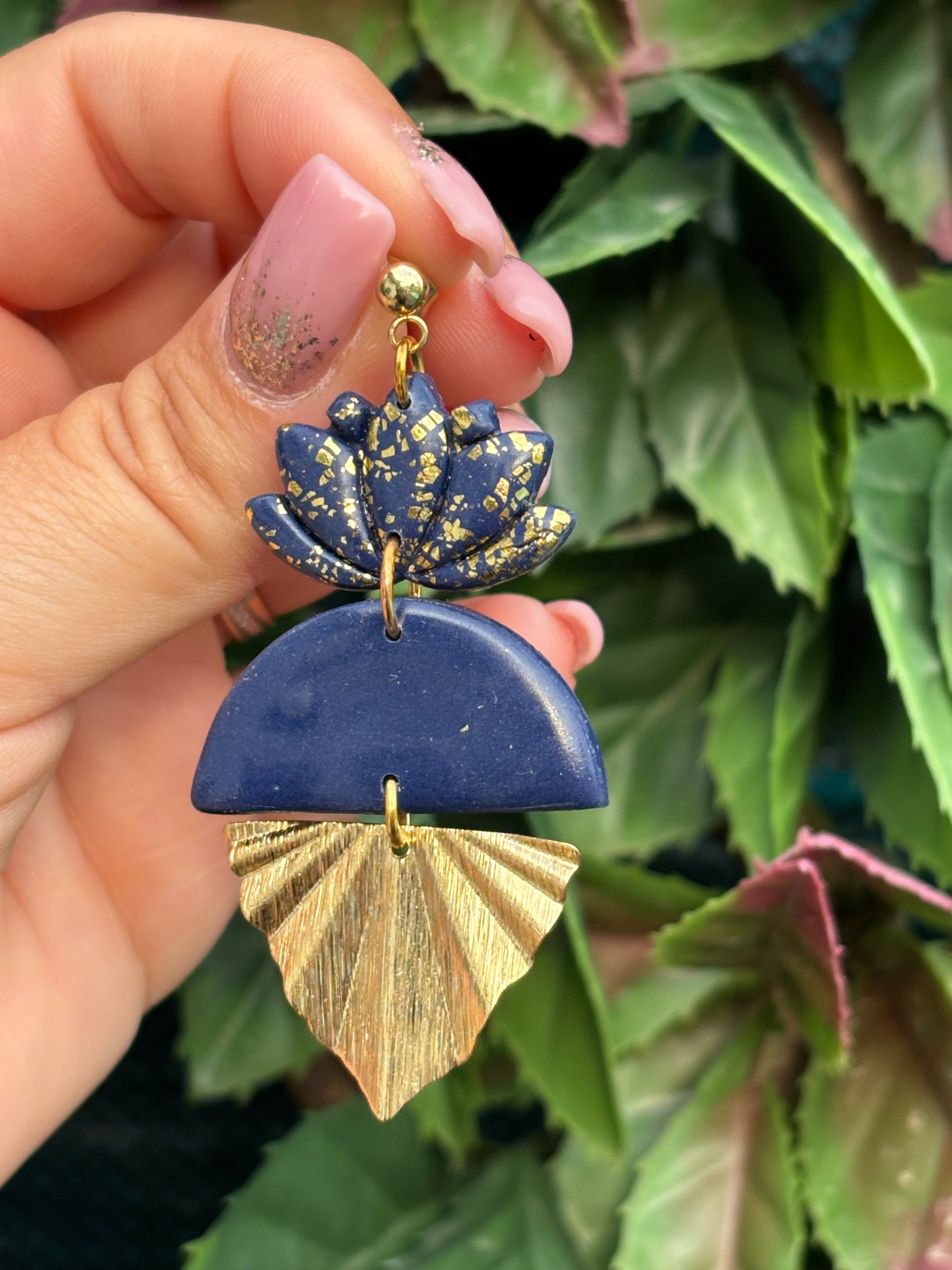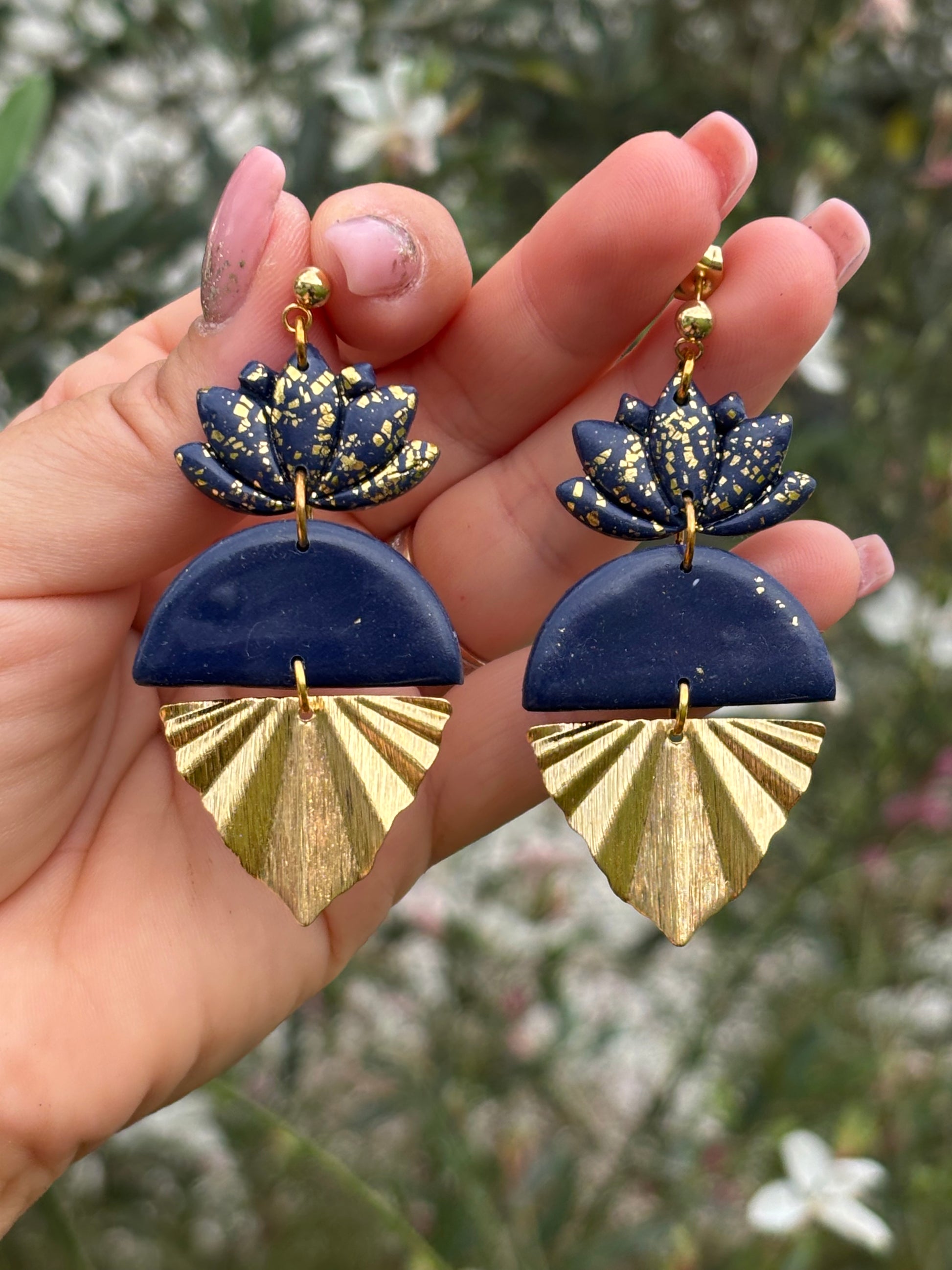 Boucles d’oreilles composées avec une forme de demie lune couplée à une forme de lotus et terminée par une demie lune dorée pliée